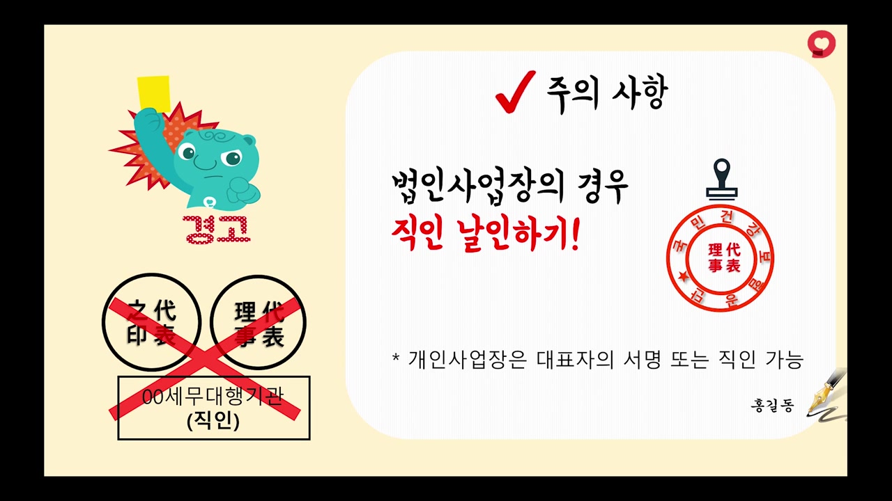법인사업장은 직인, 개인사업장은 대표자의 서명 또는 직인으로 가능합니다.