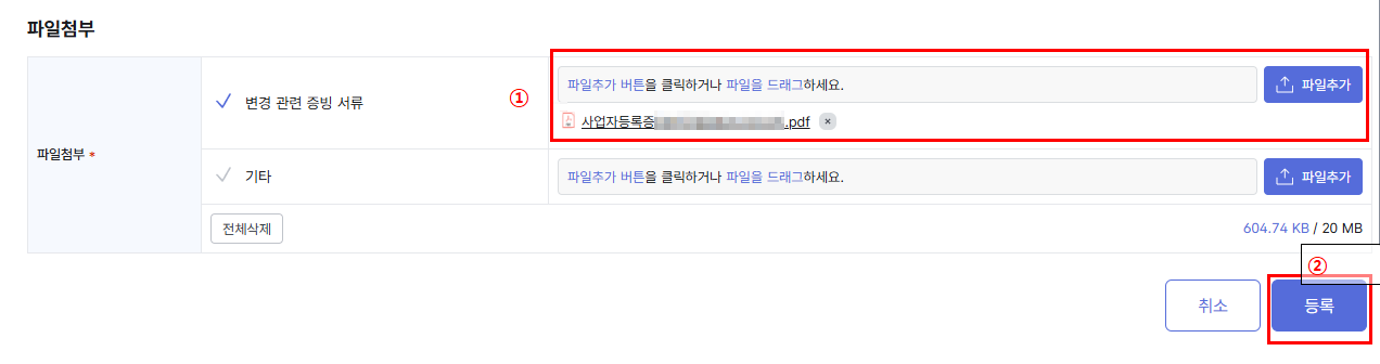 - 모든 정보 다 입력하셨으면 아래 증빙할 수 있는 파일 첨부해 주시고 등록버튼 눌러주시면 건설근로자공제회 퇴직공제 사업장정보변경 신고 접수가 마무리됩니다