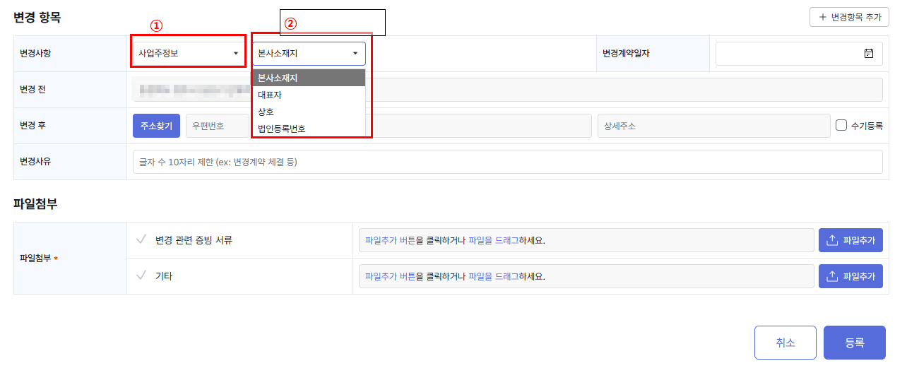 - 만약 저희같이 한가지만 변경된것이 아니라 변경할 정보가 더 있다면 오른쪽에 변경항목 추가를 눌러주시면 아래칸에 또 입력할 수 있게 한칸 더 생성됩니다.