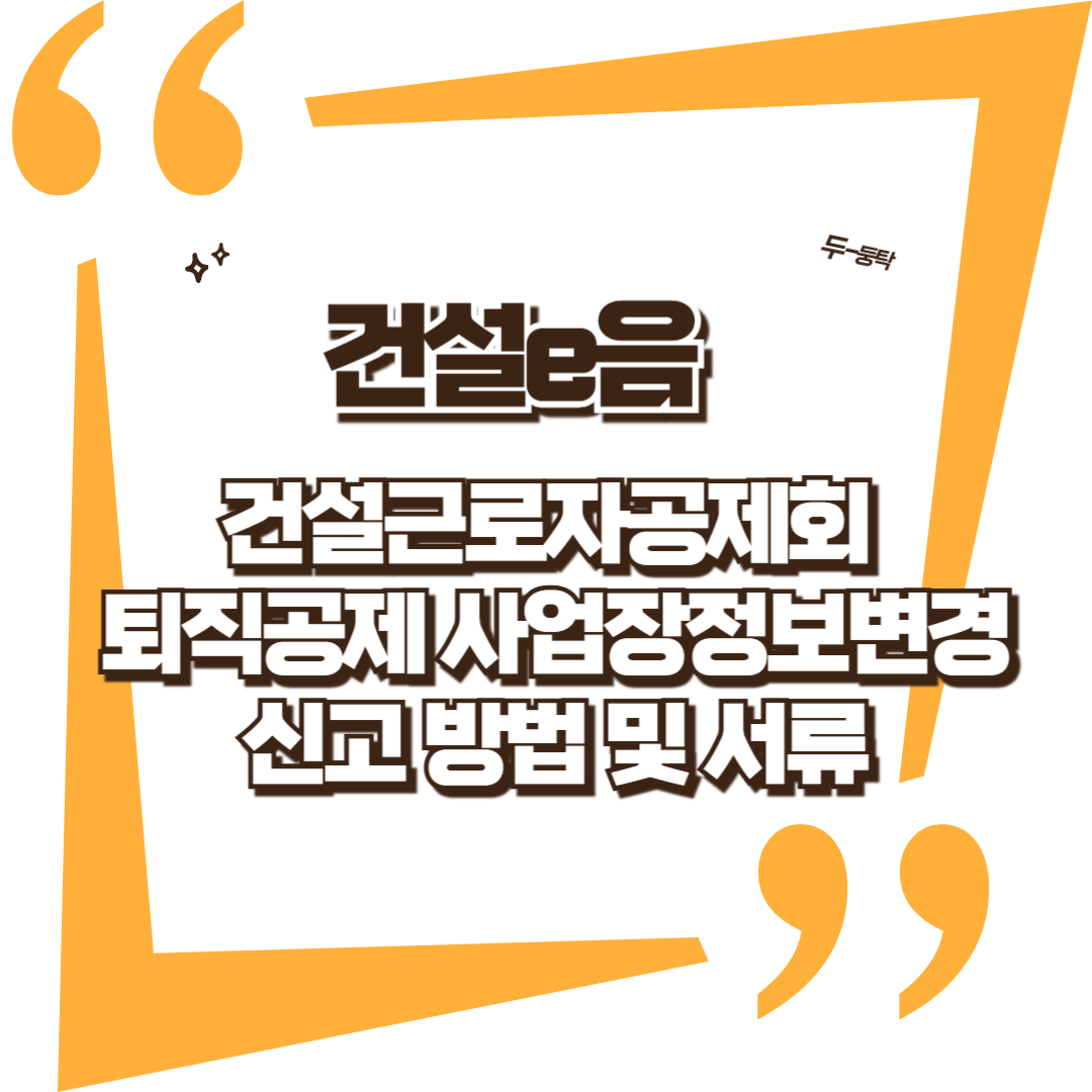 - "건설e음 시스템을 통한 건설근로자공제회 퇴직공제 사업장정보변경 신고 대상은 상호, 소재지, 대표자 변경 등이 발생한 모든 사업장입니다. 기존 EDI 대신 이제는 건설e음에 접속하여 건설근로자공제회 퇴직공제 사업장정보변경 신고를 진행해야 하며, 건설근로자공제회 퇴직공제 사업장정보변경 신고 시 사업자등록증 사본 등 증빙 자료를 반드시 준비해야 합니다. 리뉴얼된 건설e음은 더욱 직관적인 인터페이스를 제공합니다."