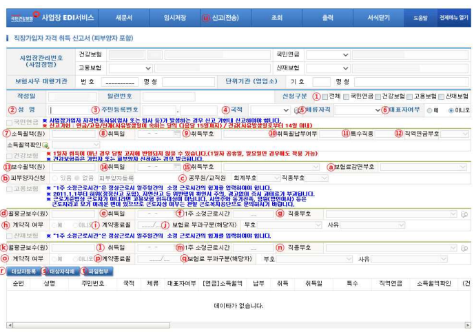 ⓓ~ⓙ : [월평균보수(원)], [취득일], [학력], [주 소정근로시간], [직종], [계약직여부], [계약종료월], [보험료 부과구분] 입력