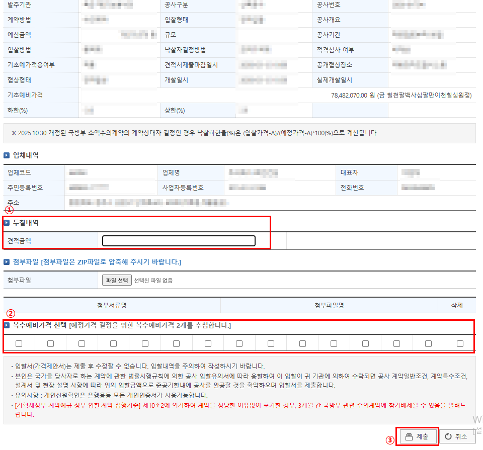 투찰내역에 입찰금액 입력 -> 복수예비가격 2개 선택 -> 제출 클릭~!!