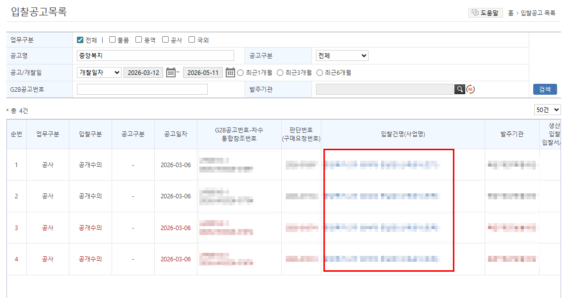 공고가 검색되면 원하는 입찰건명을 클릭해 줍니다.~