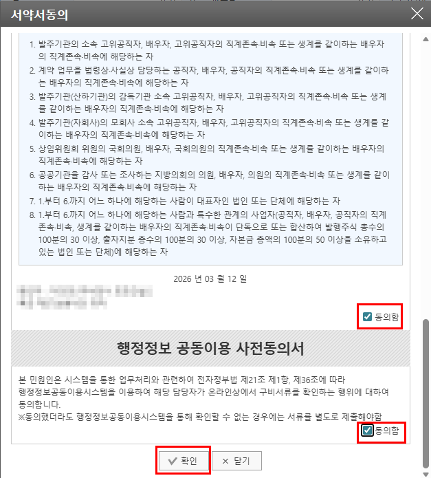 서약서 동의 화면이 나옵니다.~!! 동의에 모두 체크 후 확인버튼 클릭~!!