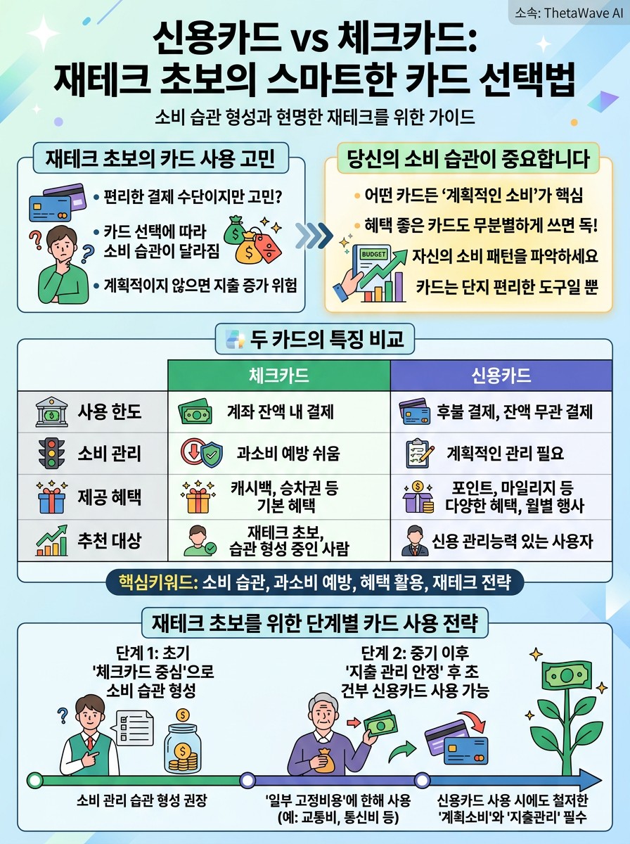 재테크를 시작하는 많은 사람들이 고민하는 것 중 하나가 바로 카드 사용입니다. 신용카드와 체크카드는 모두 편리한 결제 수단이지만 소비 관리 측면에서는 차이가 있습니다. 특히 재테크 초보라면 어떤 카드를 사용하는지에 따라 소비 습관이 크게 달라질 수 있습니다.