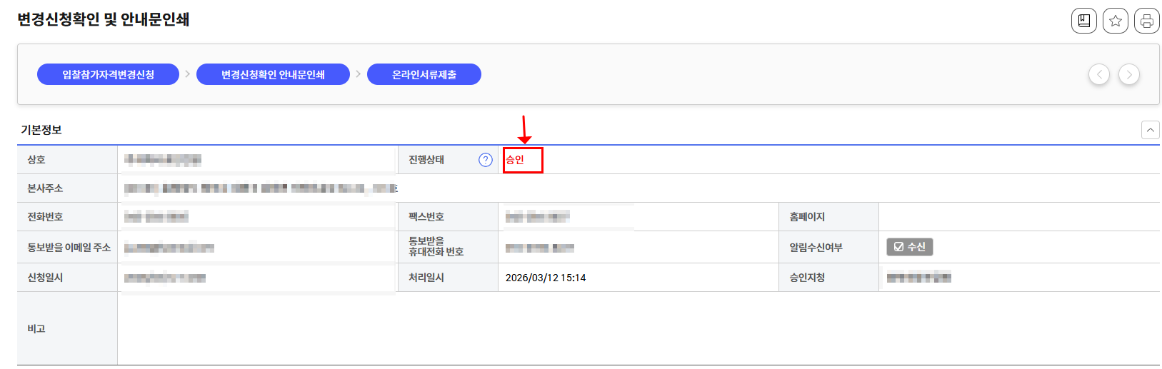 이용자관리 -> 업체정보관리 -> 변경신청확인으로 들어가서 확인하시면 되요