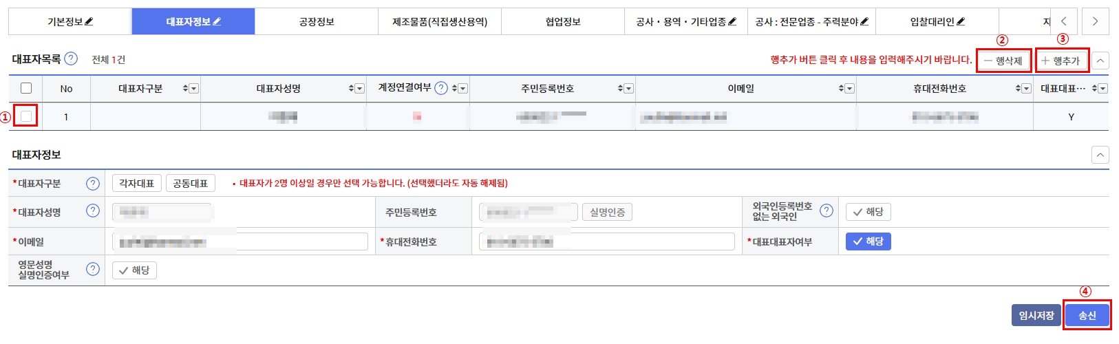 그다음 대표자 변경을 해야하니 대표자정보 탭으로 들어가서 먼저 대표자 목록에 전대표자를 체크 -> 행삭제