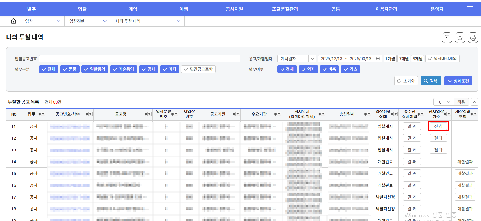 상단 메뉴에서 입찰 -> 입찰진행 -> 나의투찰내역을 선택합니다.