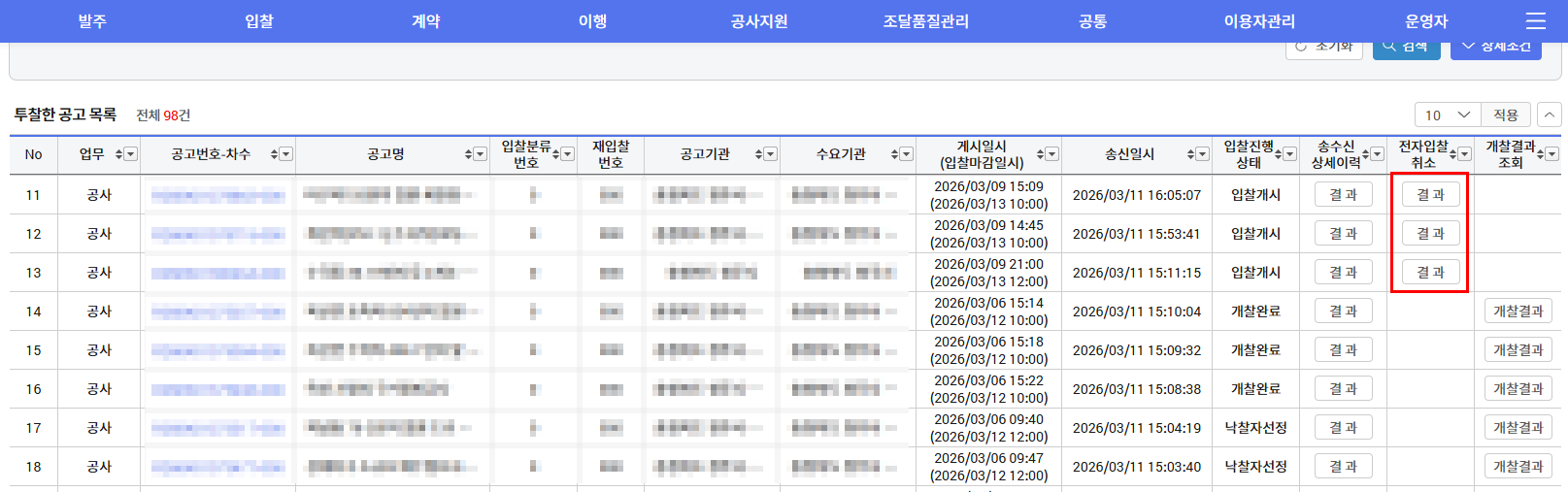 사장업 정보 변경 전 투찰한 건들이 많아서 또 1순위가 되기전에 취소라도 할 수 없을까 살펴보다가 남은 투찰건에대해 취소가능하다는 사실을 오늘에야 알아서 부랴부랴 출근하자마자 입찰취소를 하게 되었어요~