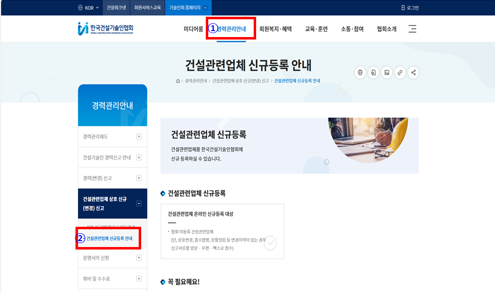 로그인 -> 경력관리 안내 -> 건설관련업체 신규등록 안내